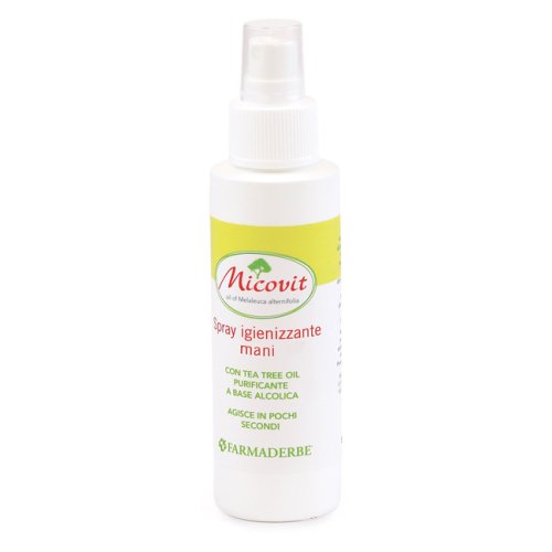 Micovit Spray Igienizzante con olio essenziale di tea tree in base alcolica è l'ideale per pulire efficacemente le mani. Particolarmente indicato anche quando si frequentano luoghi pubblici (scuola, ufficio, mezzi pubblici, ospedali, ecc.) e in viaggio, quando non si dispone di acqua e sapone. Asciuga rapidamente senza appiccicare e rilascia la tipica nota aromatica del tea tree oil.
